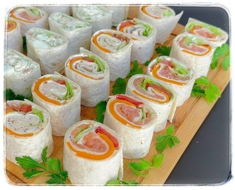 Galettes de blé enroulées avec fromage de chèvre, légumes du soleil // saumon, ciboulette // poulet, poivron // pastrami, crème de moutarde