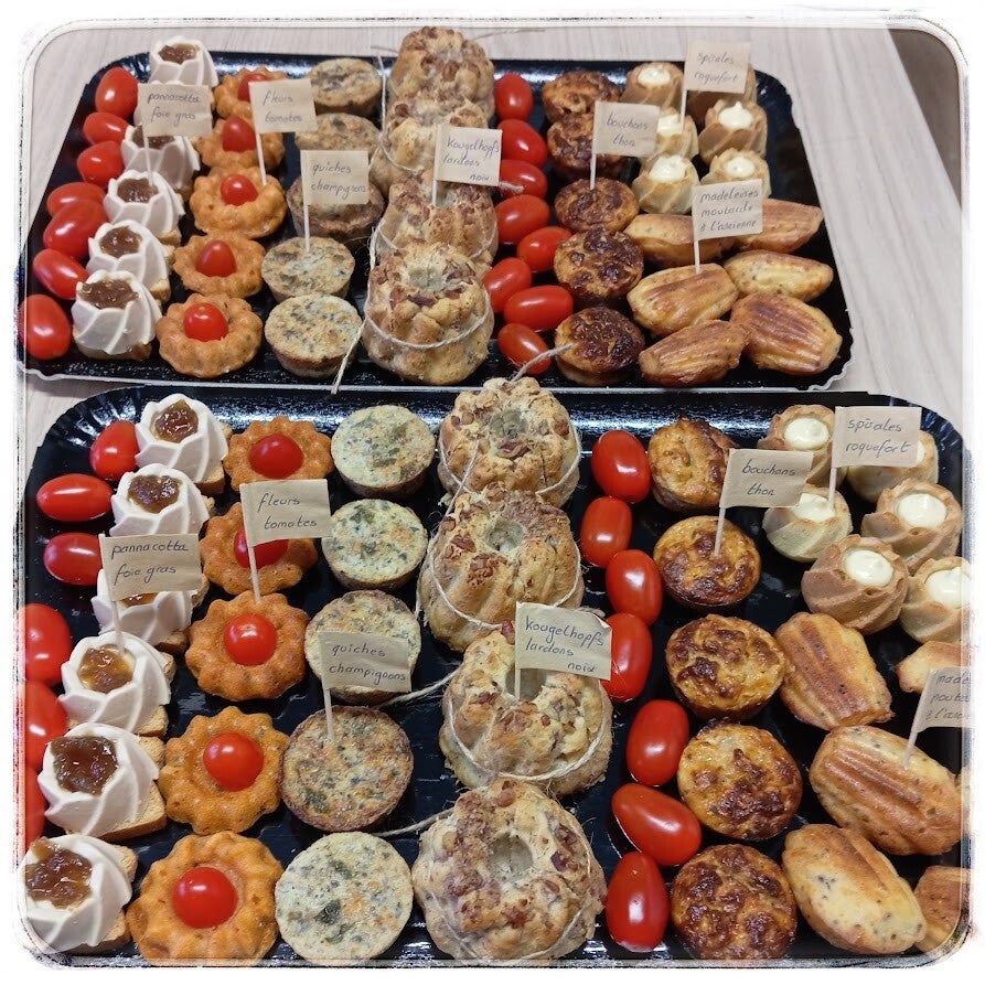 Exemple : panna cotta foie gras / bouchons au thon / fleurs de tomates séchées / kougelhopfs lardons, noix / quiches aux champignons / spirales roquefort / madeleines moutarde à l'ancienne
